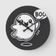 Un joyeux et ludique fantôme de dessin animé disant "Boo" dans un adorable design noir et blanc, parfait pour les thèmes d'Halloween,