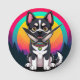 Illustration d'un joyeux chien de dessin animé assis devant un arrière - plan arc-en-ciel coloré, avec une ambiance ludique et entouré d'un paysage forestier serein, mettant l'accent sur la joie et l'art vibrant.