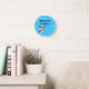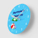 Une horloge personnalisée avec des lettres tropicales et une illustration amusante de jouets indispensables pour la plage ou la piscine ; un ballon de plage rouge, un parasol vert, des sandales et de l'huile solaire sur un fond bleu avec des vagues ondulées et des chiffres blancs en option. Personnalisez-le pour changer les polices, les couleurs, et même sauvegarder votre design pour plus tard.