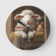 Cette illustration pleine de chaleur représente un mouton blanc moelleux portant un foulard tricoté coloré, niché dans le foin dans une caisse en bois rustique à l'intérieur d'une grange. Un mignon lapin brun regarde derrière les moutons. Des fleurs sauvages colorés et des feuilles d'automne ornent le premier plan, créant une scène charmante et cosy.