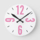 Horloge ronde à nombres grands modernes rose et noir. Elle affiche les nombres 3, 6, 9 et 12 en rose en grande taille et des lignes noires au lieu des autres nombres.