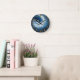 Somewhere in space a blue planet resembling earth sits in a swirl of clouds. Yellow stars glow on the blue space background. Golden numbers mark each hour on this space wall clock.
