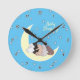 Des étoiles blanches bordées de noir entourent quatre chatons endormis blottis les uns contre les autres sur un croissant de lune jaune pâle. Changez le texte « Bébé dort » pour vos propres mots pour personnaliser votre horloge. L'arrière-plan bleu actuel peut être changé en une autre couleur en utilisant le bouton Modifier la conception.