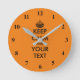 Personnalisé Conserver le calme petite taille colorée orange Horloge ronde. Créez votre propre humour, gardez votre calme et continuez votre parodie. Les couleurs Arrière - plans peuvent être modifiées. Idéal pour la cuisine murale, salle d'étude, chambre, bureau, entreprise, restaurant, boutique, hôtel etc. Également disponible en grande et carré forme. Couleur de la main grise ou noire.
