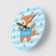 Décorez la pièce d'enfants avec cette horloge mignonne et colorée. Elle fait habiller petit un renard brun-rougeâtre et mignon dans un T-shirt bleu lumineux ondulant ses pattes amicales. Personnalisez avec le nom de l'enfant dans l'espace disponible. Rayures horizontales bleu-clair comme arrière - plan. Grand pour la pièce de garçons avec sa chambre à coucher bleue de combinaison de couleurs ou d'enfants avec un thème d'animaux de forêt.