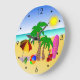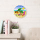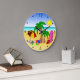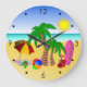 À La Plage © Sunny Mars Designs. Cette grande horloge murale ronde cool colorée et mignonne illustre un vectoriel amusant d'une scène de plage avec des éléments de plage dont un parasol, une balle de plage, des tongs, un seau et un pique, des palmiers, une serviette de plage et un planche de surf. Un cadeau parfait pour les amateurs de plage.