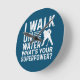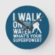 Horloge murale du joueur de hockey avec un dicton humoristique présente du texte blanc sur un arrière - plan bleu et un joueur de hockey silhouette blanche. Le texte sur cette horloge de joueur de hockey dit : Je marche sur l'eau Qu'est-ce que ta superpuissance ?
