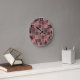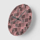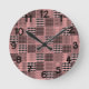 Cette horloge murale a un design Boho de carrés avec des motifs dans chacun en noir et rose.