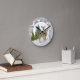 Cette horloge murale ronde conçue pour les fêtes d'hiver présente un design de refuge pour les fêtes dans un paysage hivernal. Si vous aimez la faune, la nature et la saison hivernale, vous adorerez cette horloge murale. Le design a été créé à partir d'une variété d'illustrations du domaine public, puis un cadre de flocon de neige a été ajouté comme bordure.