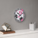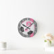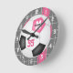 This cute and sporty soccer themed clock feobjets a simple soccer ball graphic upon which you can customize the athlete's name, monogram and jersey number - some of the soccer ball's black panels have recolored pink - the background is medium gray overlying goal varaccent graphic, pink sity stripes and white clock face numerals - by katz_d_zynski