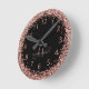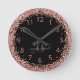 Glam Rose Gold Parties scintillant Élégante Monogramme Horloge. Personnalisez facilement ce design d'horloge chic et branché avec une élégante parties scintillant brillante d'or rose sur un arrière - plan noir. Le design comprend votre monogramme manuscrit avec de jolis tourbillons et votre nom.