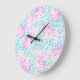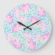 Une belle et féminine grande horloge murale ronde, avec un motif de roses rose vif sur un arrière - plan bleu ciel, parsemée de petits papillons blancs.