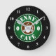Small coffee shop wall clock with custom name. Trendy decor for kitchen, cafe, cafeteria, restaurant, company, office, bar or shop. Vintage brown et green colors. Personalize with your own funny quote, saying or name. Make your own decor. Trendy decorations for coffee lovers and caffeine addicts. Coffee bean and cup logo.