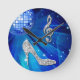 Élégant, glamorous personnalisé Wall Clock. Beautiful, dazzling, trendy printed image with Silver sparkles diamonds bling jewels Note musicale, funky blue retro disco mirball and silver stiletto high heel fashion shoe on a chic Printed image background. A cute, classy, fashionable, stylish, pretty venin pour ou any music lover. Women and teenage girls veut love this cool, fun, funky, girly design.