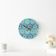 Cette horloge a un design géométrique d'hexagones dans quatre nuances de bleu sur un champ de rayures bronzées dans deux nuances.