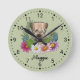 L'illustration originale de Destei d'un joli chien de race Wheaten, recouvert de pâte molle, entourée de fleurs sauvages d'été colorés. Il y a une fleur rose rousse, une fleur violette, une fleur rose foncé et une fleur marguerite blanche ainsi que quelques feuilles verts et des branches. La couleur arrière - plan est verte avec un motif à pois clair. La couleur de l'arrière - plan peut être changée en n'importe quelle autre couleur et le motif de pois peut être enlevé, si vous le souhaitez. Les heures sont marquées de chiffres. Les heures et minutes sont affichées avec une face pointillée d'horloge. Il y a aussi une zone de texte personnalisable pour un nom ou un autre texte personnalisé dans une belle police de script.