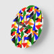 This wall clock has a Bauhaus design of a collage of triangles in red, yellow, orange, blue, and green.
