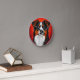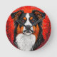 Tête de chien sur fond circulaire rouge audacieux. Le chien présente des marques distinctives avec une fourrure noire, marron et blanche, et des yeux orange saisissants, lui donnant un air expressif et captivant.
