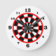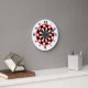 This bold design resembles a dartboard & makes a perfect clock for a game room. The center features concentric red circles with black squares on a white background. Large black numbers on the plain white make it easy to tell the time.