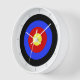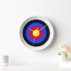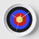 Une horloge murale ronde pour archers, entraîneurs et instructeurs de tir à l'arc, chasseurs d'arc et autres compétiteurs de tir compétitifs, avec une cible de tir classique avec un bullseye jaune entouré d'anneaux rouges, bleus, noirs et blancs.