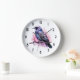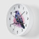 Une horloge avec l'image d'un corbeau noir aux ailes violettes roses. Une aquarelle rose derrière cet oiseau mystique.