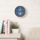 Une grande ancre vintage en blanc apparaît sur un arrière - plan rustique en bois bleu cobalt pour faire cette grande horloge murale à thème nautique avec des couleurs de plage cool.