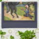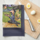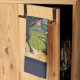 Cette serviette de cuisine a l'illustration de Kristie Hubler, montrant un Ichabod effrayé arrêté par le cavalier sans tête seulement pour être invité à échanger un citrouille contre de la tarte. Le pont couvert est dans l'arrière - plan, avec une grande lune de moisson de minuit dans le ciel.