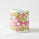 This is a vibrant and floral "Hot Momma" Mother's Day Mug features a wrap-around design with a bold, hand-painted writing, leaves and flowers. This mug is covered in a lush pattern of bright carnations and green foliage.