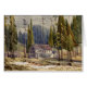Peinture d'aquarelle d'un hôtel à trois étages et des annexes encerclés par le séquoia et d'autres arbres dans le comté de Calaveras, la Californie.