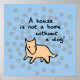 A fun graphic art poster for dog lovers. The poster is made of simple A house is not a home without a dog! saying and a cute cartoon dog illustration. The cheerful blue background is filled with paw prints. Fun little poster for the home of a dog owner or dog owning family.