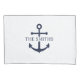 Design nautique personnalisé avec ancre bleu marine avec votre nom de famille personnalisé dans une police serif classique. Un accent varié d'inspiration côtière, parfait pour améliorer le style de maison de plage, le séjour en maison de lac, la décoration en bord de mer, ou comme un cadeau unique et réfléchi de ménage.
