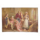 Ce dessin présente un tableau de l'artiste américain Jean Leon Gerome Ferris (1863-1930). Il montre le premier drapeau des Etats-Unis d'Amérique cousu par Betsy Ross (Elizabeth Griscom Ross), qui était un tapissier américain crédité de sa création. On dit que le général George Washington, commandant en chef de l'Armée continentale et deux membres d'un comité du Congrès (Robert Morris et George Ross) ont rendu visite à Mme Ross; elle a convaincu George Washington de changer la forme des étoiles dans un croquis d'un drapeau qu'il lui a montré de six à cinq pointes en démontrant qu'il était plus facile et plus rapide de couper ce dernier. L'histoire peut, en fait, être apocryphe, mais elle fait maintenant partie de la tradition américaine. Le drapeau "Betsy Ross", avec son cercle d'étoiles facilement identifiable, est aujourd'hui arboré comme un symbole de patriotisme et de fierté dans l'histoire américaine.