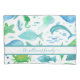 Sous la mer, thème océan. Un arrière - plan blanc chic avec un motif d'eau de la vie marine, poissons, dauphins, baleine, tortue, hippocampe, méduses en vert, bleu et turquoise. Parfait pour une maison de plage/chalet ou maison d'été. Personnalisez et ajoutez votre prénom ou votre nom de famille. Le nom est écrit avec un script bleu vert à la main avec des swashes. Pour que les swashes ne suppriment que le nom de l'échantillon, laissez les espaces ou émoticônes devant et après le nom.