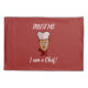 Chef avec casquette, collier rouge et texte personnalisé.