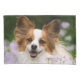 Un chien blanc et rouge de Papillon se reposant dans un pré entouré par Cuckooflower. Le Papillon est une race d'alerte, amicale et très futée de jouet. Une petite belle photo de chienchien prise par Katho Menden, cette caisse confortable de coussin est une idée spéciale enchanteresse de cadeau pour des amoureux de les chiens. http://www.zazzle.com/kathom_photo