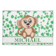 Ce mignon singe est assis et attend de jouer. Derrière lui se trouve un arrière - plan blanc avec un motif feuille de la jungle. Sous lui se trouve le nom de votre enfant, qui joue dans la forêt tropicale avec lui. Ajoutez un mignon pote à la soirée de votre enfant ou une soirée cinéma familiale.