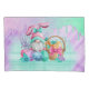 Easter Bunny Gnome with pink bunny ears sitting in spring flowers with decorated eggs and a wicker basket of carrots set on a watercolor teal and purple plaid background with pastel candy icing drips.