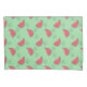 Un design coque coussin mignon et fantaisiste avec un motif de tranches de pastèque rose qui ont des bouchées enlevées d'elles, entouré de fleurs vertes, le tout sur un arrière - plan vert menthe pâle.