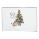 Lying on his stomach next to the base of the tree is a small, pouting boy wearing a green shirt and blue shorts, resting his chin on his hands. A striped Christmas ornament is comically placed on top of his head.