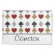 Ces coques coussins personnalisés disposent d'un thème de poker ou casino jouant aux cartes avec les symboles pour les différents costumes. Les coeurs sont imprimés en rouge, les clubs en or, les pique en noir, et les diamants en argent. Les images sont imprimées dans un motif carrelé à travers le tapis. Un nom d'exemple est imprimé en bas. Vous pouvez personnaliser les coques coussins pour inclure votre propre nom personnalisé ou un autre texte.
