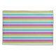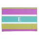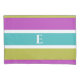 Un oreiller réversible à rayures rose, citron vert, bleu turquoise et blanc. Les rayures sont larges d'un côté de la coussin, étroites de l'autre. La taie d'oreiller colorée peut être customisée avec votre initiale, présentée comme un monogramme élégant au centre du côté large rayé de la coussin.