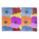 Cette taie d'oreiller a une conception printanière de violet, bleu, orange et rouge avec des panneaux jaunes disposés l'un sur l'autre sur un champ de jaune.