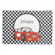 Mignonne voiture de course rouge caricature sur le drapeau blanc et noir à damiers porte-oreiller taille standard du petit garçon. Personnalisé avec le nom de votre enfant.
