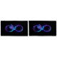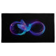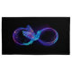 Glowing, purple infinity symbole with flying, luminous, blue hummingbird on black background. Néon.