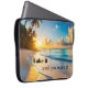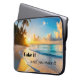 Manche d'ordinateur portable avec tableau d'un coucher de soleil sur une plage tropicale avec palmiers, avec vos textes (amusants ou autres) (en option).