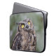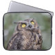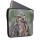 A neoprene laptop sleeve featuring a wide-eyed great horned owl. This young owl was turning its head to watch a song bird. It resulted it a rather humorous wide-eyed expression.