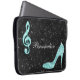 Caisse personnalisée élégante et fascinante d'ordinateur portable. Beau, brillant, le bleu turquoise à la mode/turquoise d'image imprimée miroite des diamants bling des bijoux chaussure de mode de talon haut de note musicale et de stylet sur un arrière - plan scintillant noir chic d'image imprimée de parties scintillantes. Un cadeau mignon, chic, à la mode, élégant, joli pour elle ou tout mélomane. Les femmes et les adolescentes aimeront ce cool, amusement, conception géniale et girly.