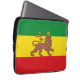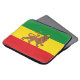 A laptop sleeve with a historical flag of Ethiopia; red, golden and green horizontal stripes with Lion of Judah with a crown and spear in the center; used from 1897 to 1974