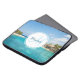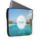 Une pochette pour ordinateur portable avec une belle photo représentant un complexe balnéaire tropical. Jolie plage de sable blanc et d'eau bleue avec des paillotes, ce qui lui donne une ambiance insulaire tranquille. Un cercle blanc superposé avec votre nom et votre monogramme initial à l'intérieur.