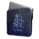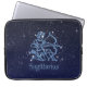Manche d'ordinateur portable avec le symbole de Sagittarius en bleu argenté doux, recouvert d'étoiles de la constellation, contre un arrière - plan étoilé du bleu profond de minuit au noir
